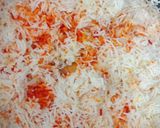أضف لون البرياني الأحمر وبخاخ الزعفران والزبدة للأرز واتركه جانبًا.